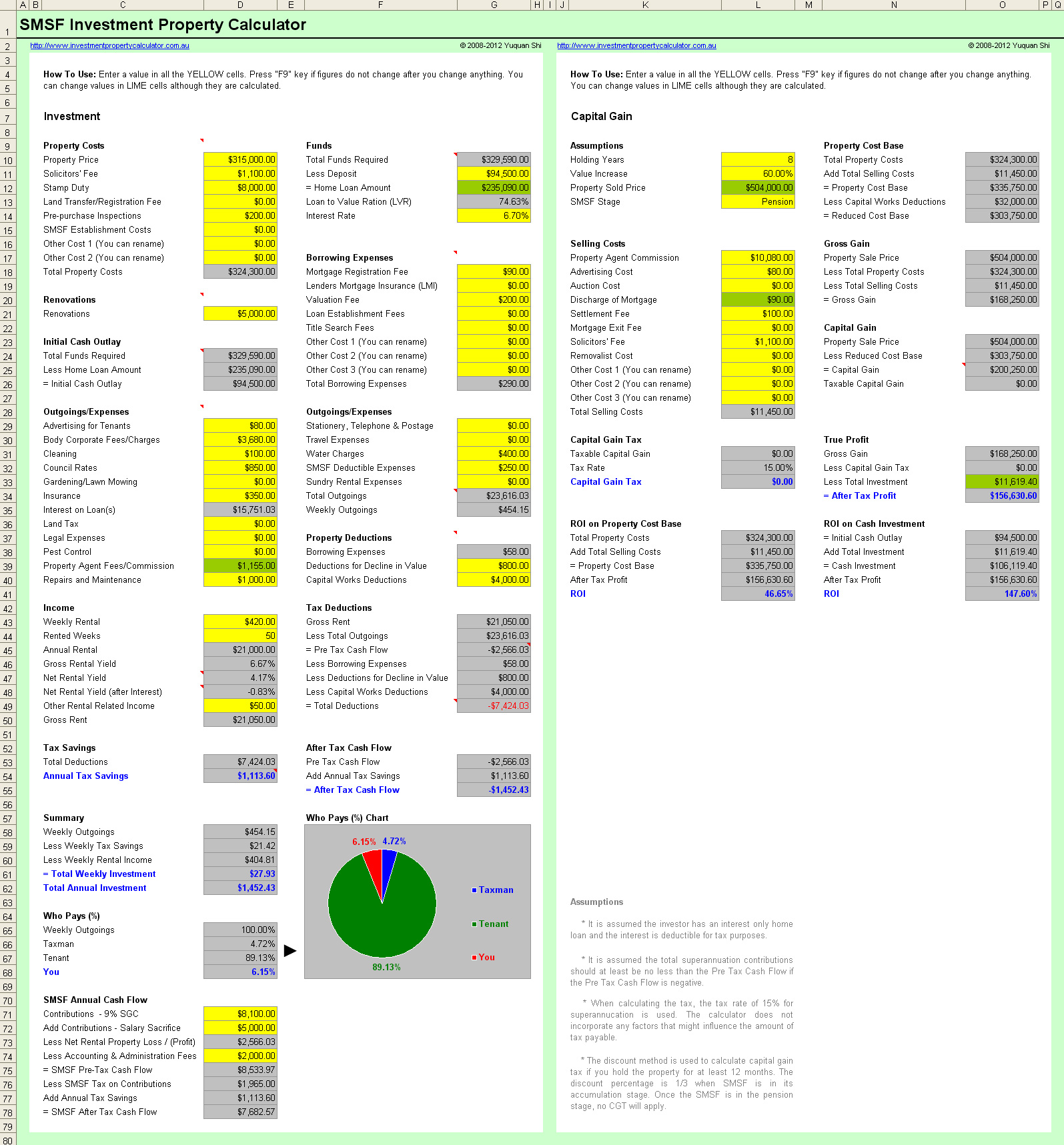 Here is a screenshot that will give you a better idea that what you need to do and what this SMSF Investment Property calculator can do for you.