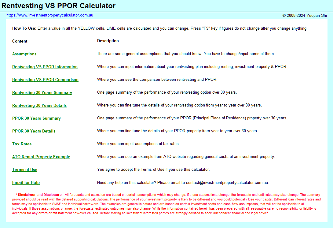 The Rentvesting VS PPOR Calculator Spreadsheet has the following assumptions. Certain assumptions listed here can be adjusted by the users.