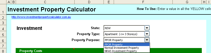 (5) Now you should be able to choose either "PPOR Property" or "NRAS Investment Property" from the Property Purpose drop-down menu (next to Cell D6).